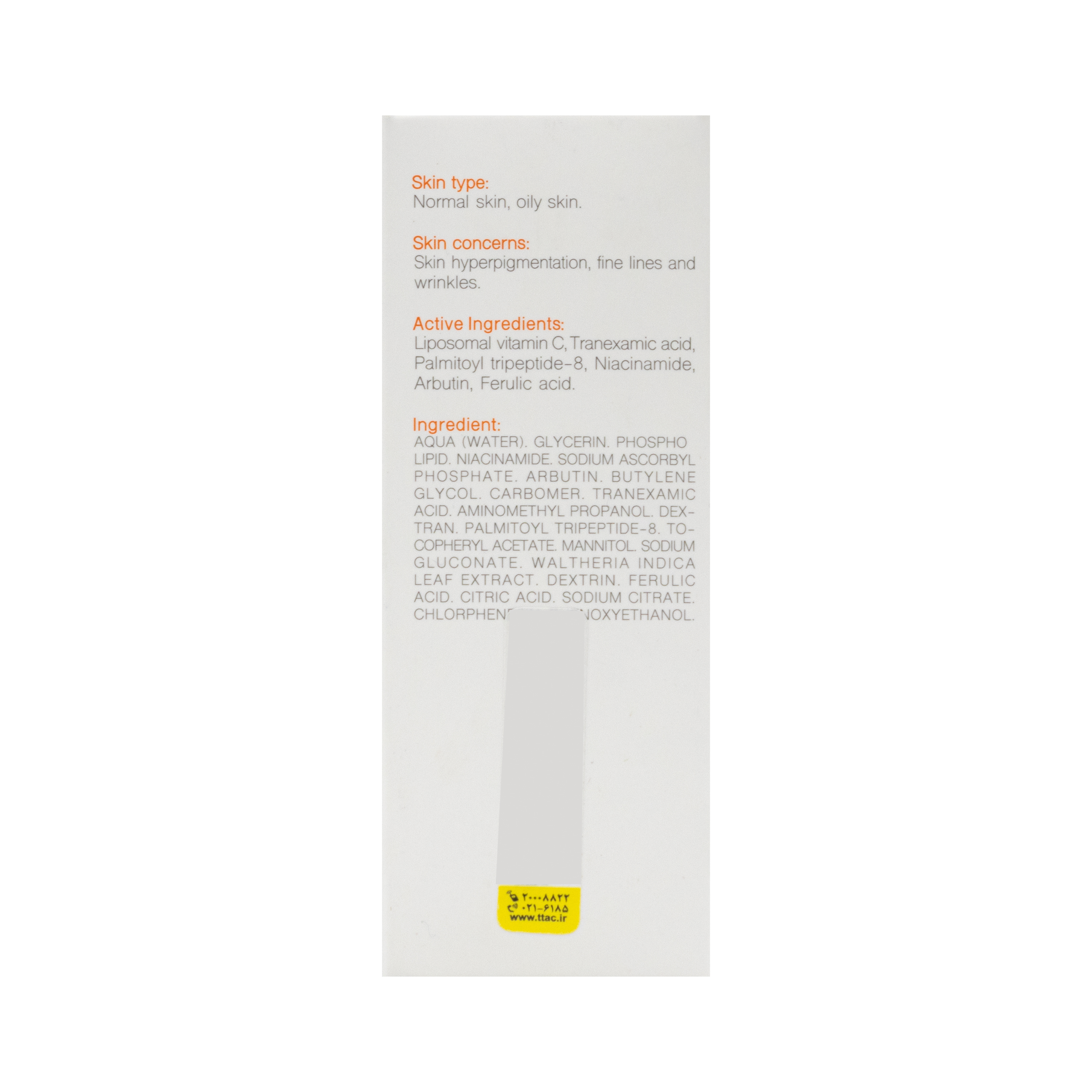 - آربوتین, ترانگزامیک اسید, فرولیک اسید, نیاسینامید, ویتامین سی 25 درصد به فرم لیپوزومال (ویتامین سی 25% پایدار در کمپلکس لیپوزومی)