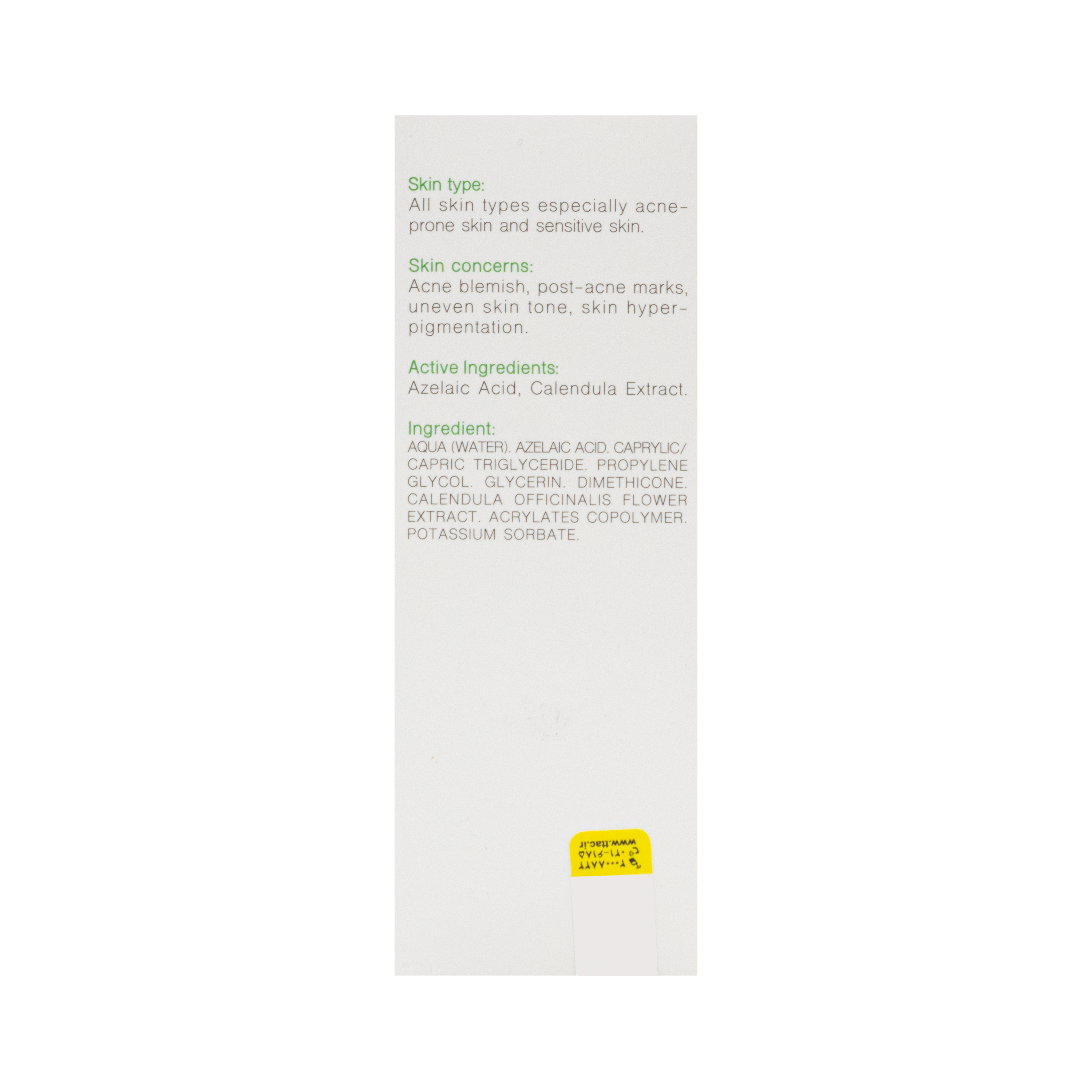 - این محصول به دلیل دارا بودن خاصیت ضد التهابی در کاهش التهابات پوستی نیز اثربخش است. علاوه بر این، به علت خاصیت لایه برداری آزلائیک اسید، لایه برداری سلول های مرده لایه شاخی تسریع شده که در نتیجه از وقوع انسداد فولیکولی پیشگیری میشود.
