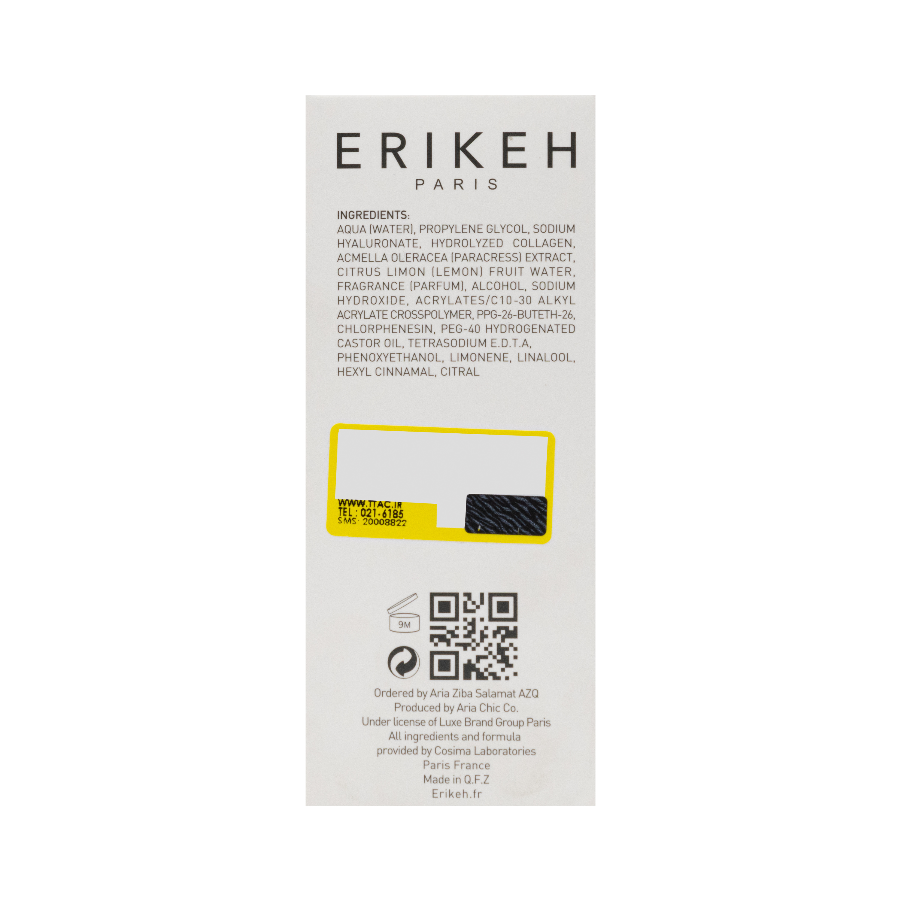 - آب، پروپیلن گلیکول، سدیم هیالورونات، کلاژن هیدرولیز شده، عصاره آکملا اولراسه (پاراکرس)، آب لیمو، عطر، الکل، سدیم هیدروکسید، آکریلاتها/C10-30 آلکیل آکریلات کراسپلیمر، PPG-26-بوتت-26، کلرفنزین، روغن کرچک هیدروژنه PEG-40، تتراسدیم E.D.T.A، فنوکسی اتانول، لیمونن، لینالول، هگزیل سینامال، سیترال