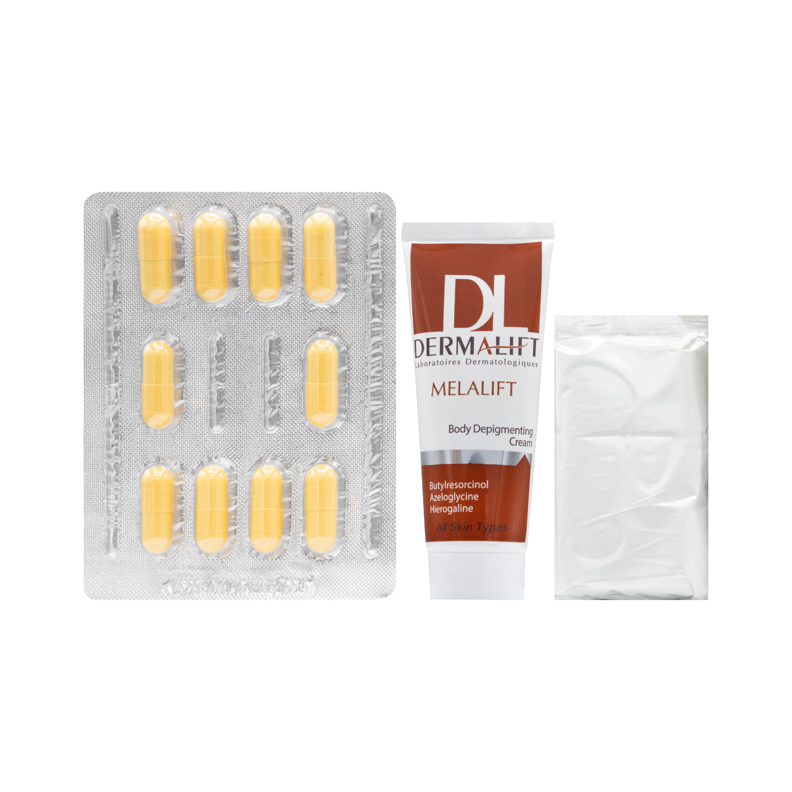 پک روشنکننده بدن شامل پن، کرم، ژل اسکراپ، لوسیون و کپسول خوراکی است که تیرگیها و لکها را هدف قرار داده و پوست را شفاف، نرم و یکنواخت میکند.