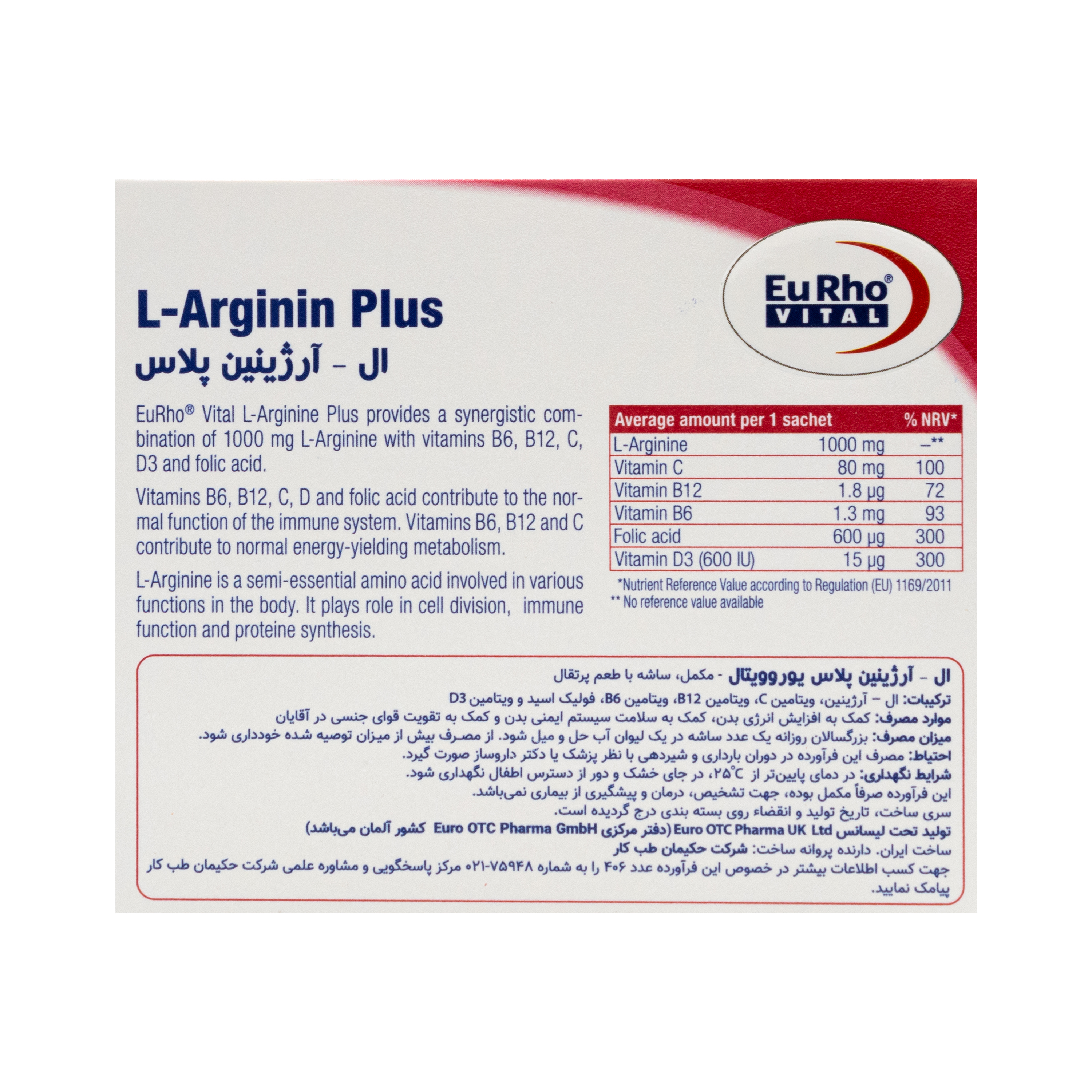 ساشه ال-آرژینین پلاس یوروویتال حاوی 1000 میلیگرم ال-آرژینین بههمراه فولیک اسید و ویتامینهای C، B12، B6 و D است که به افزایش سطح انرژی، تقویت سیستم ایمنی، ارتقای قوای جنسی در آقایان و بهبود عملکرد ورزشی کمک میکند.