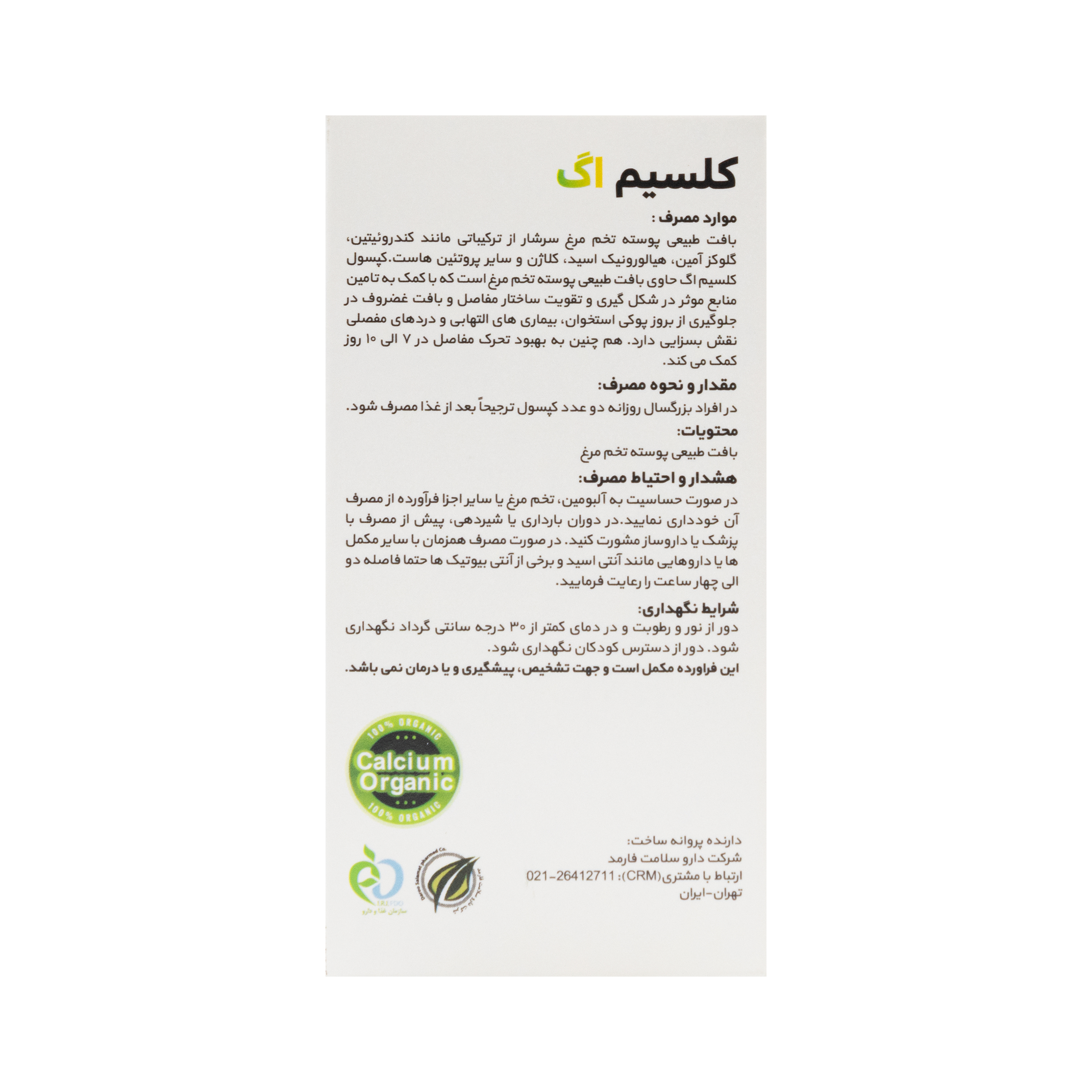 حاوی بافت طبیعی پوسته تخم مرغ (حاوی کلسیم کربنات و NEM) منبع طبیعی کلاژن، گلوکزآمین، کندروئیتین، هیالورونیک اسید
