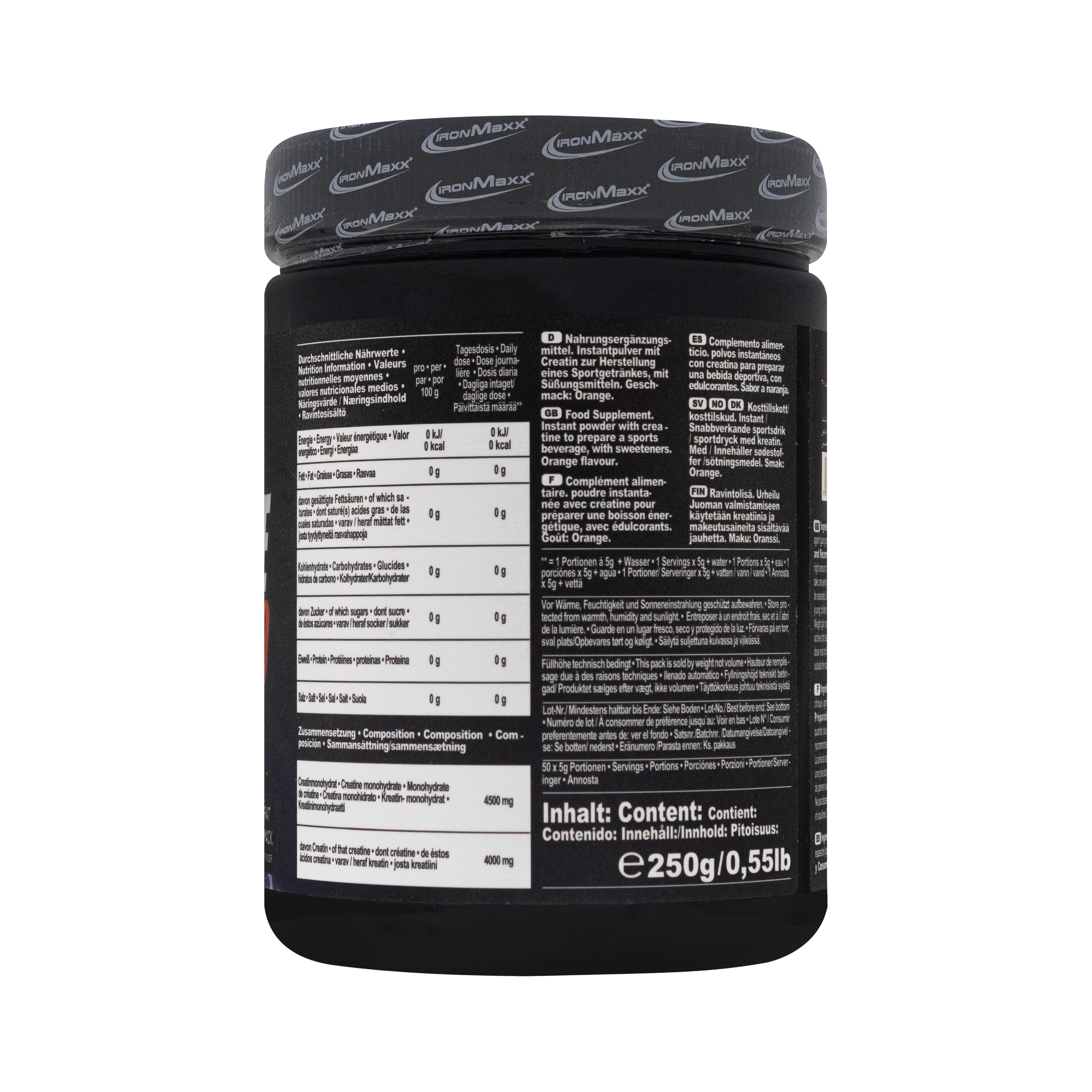 GB Ingredients: Creatine monohydrate (90.7%), acidifier (citric acid), thickening intag agent (guar gum), flavourings, sweeteners (aspartame), color E160a