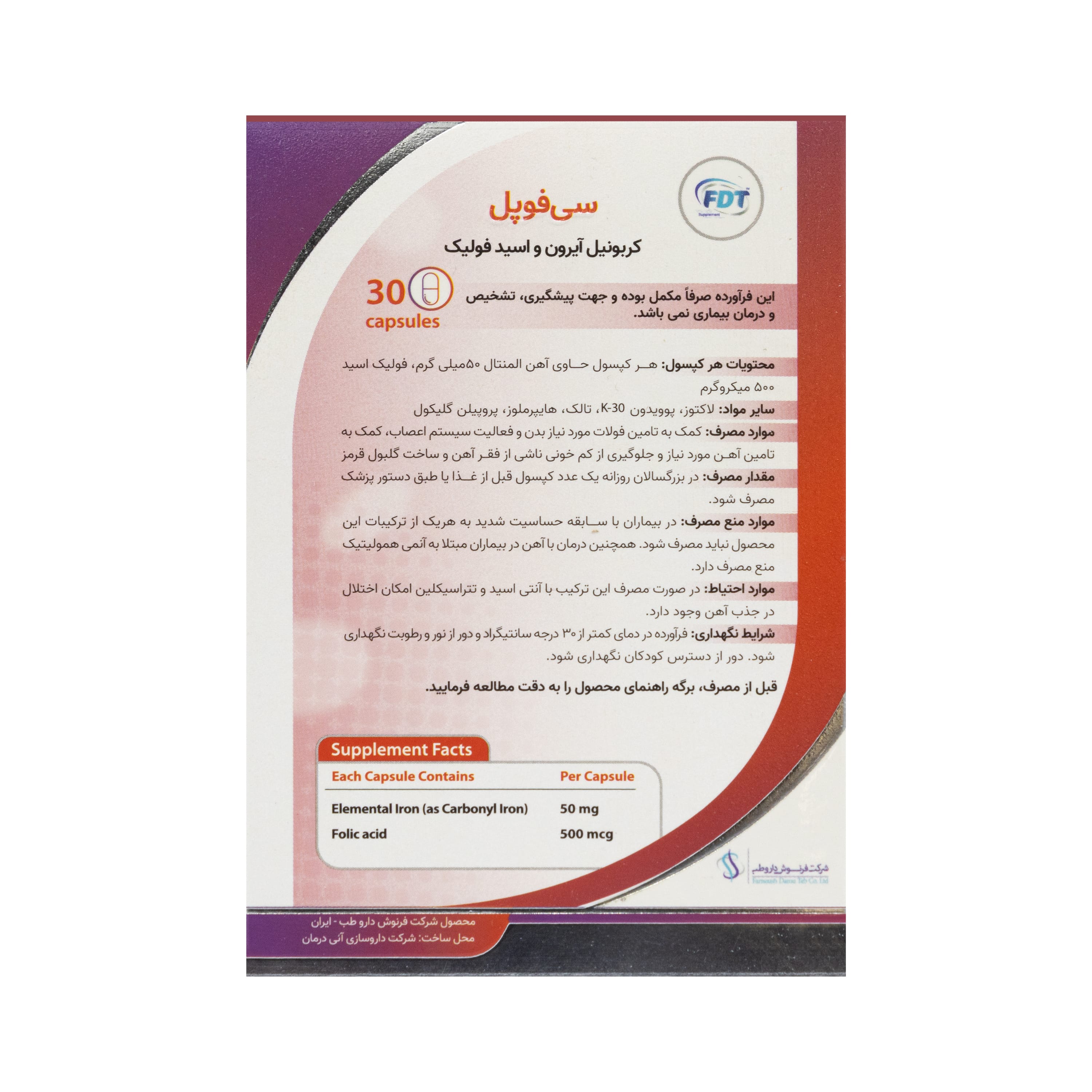 - هر کپسول حاوی آهن المنتال 50 میلی گرم و فولیک اسید 500 میکروگرم