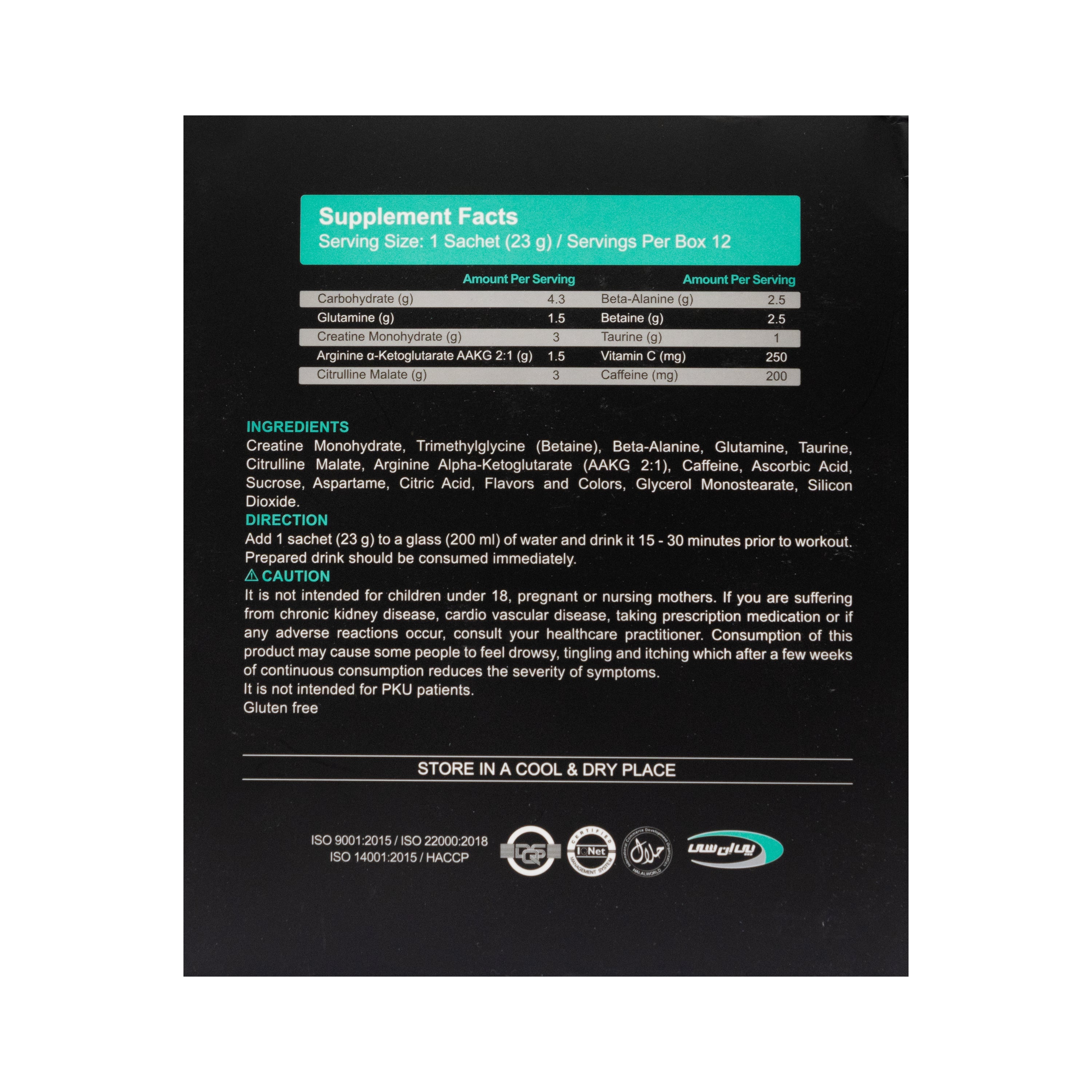 - محتوی هر ساشه (23 گرم) را در یک لیوان آب (200 میلی لیتر) آب حل نموده 15 تا 30 دقیقه قبل از شروع ورزش مصرف کنید.