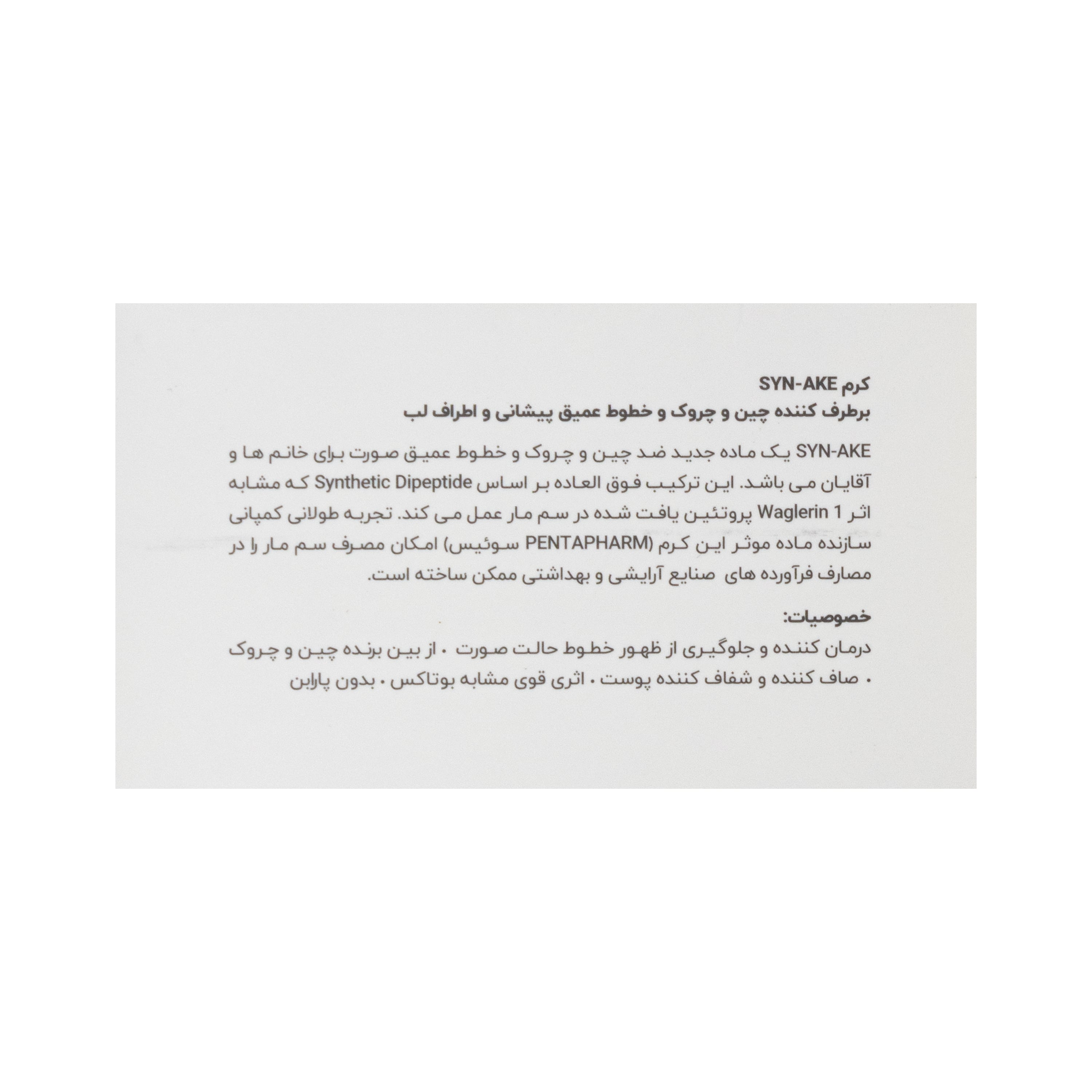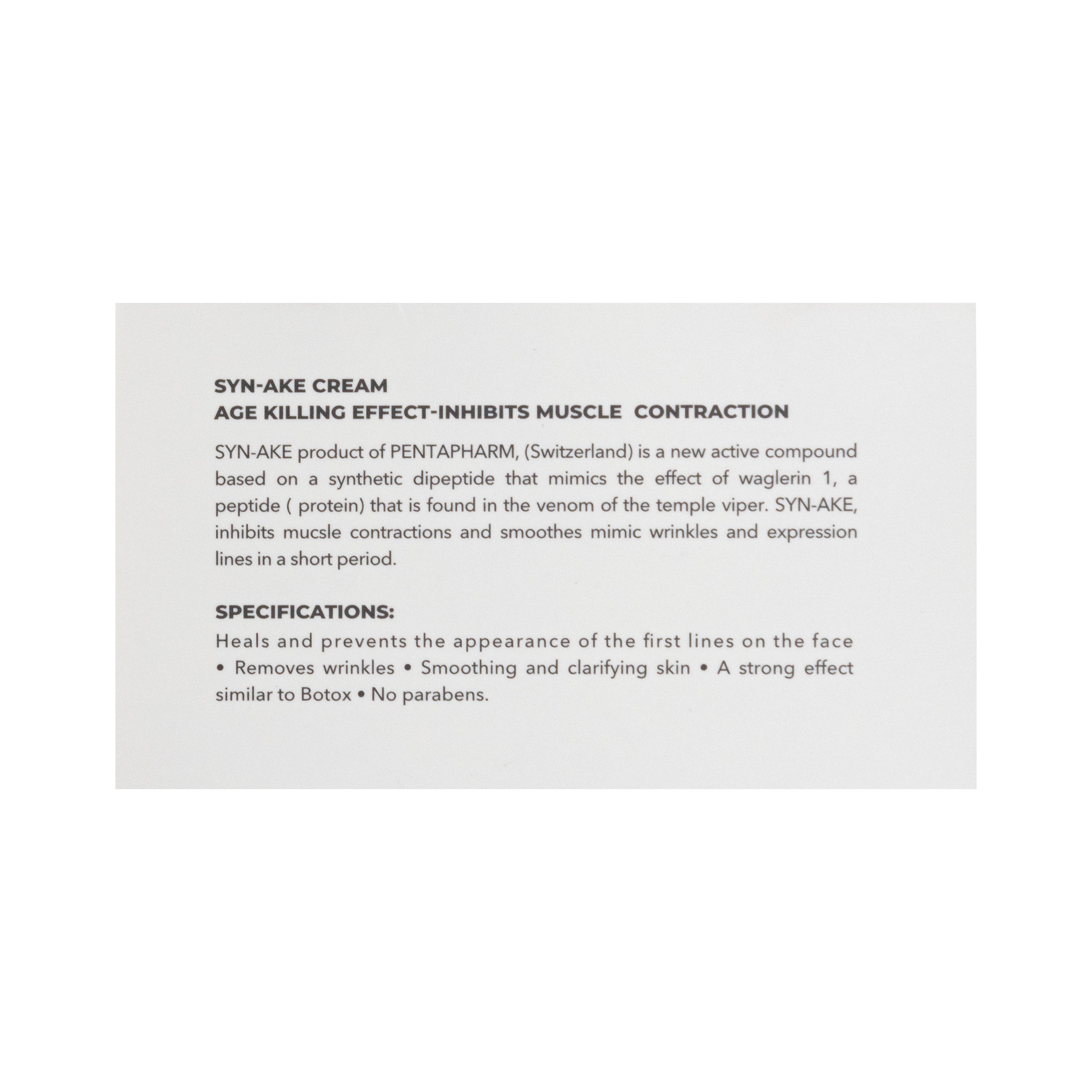 - SYN-AKE یک ماده جدید ضد چین و چروک و خطوط عمیق صورت برای خانمها و آقایان می باشد. این ترکیب فوق العاده براساس Synthetic Tripeptide که مشابه اثر Waglerin1 پروتئین یافت شده در سم مار عمل می کند. تجربه طولانی کمپانی ساده ماده موثر این کرم (Pentapharm سوئیس) امکان مصرف (Peptide) سم مار را در مصارف فرآورده های آرایشی و بهداشتی ممکن ساخته است.