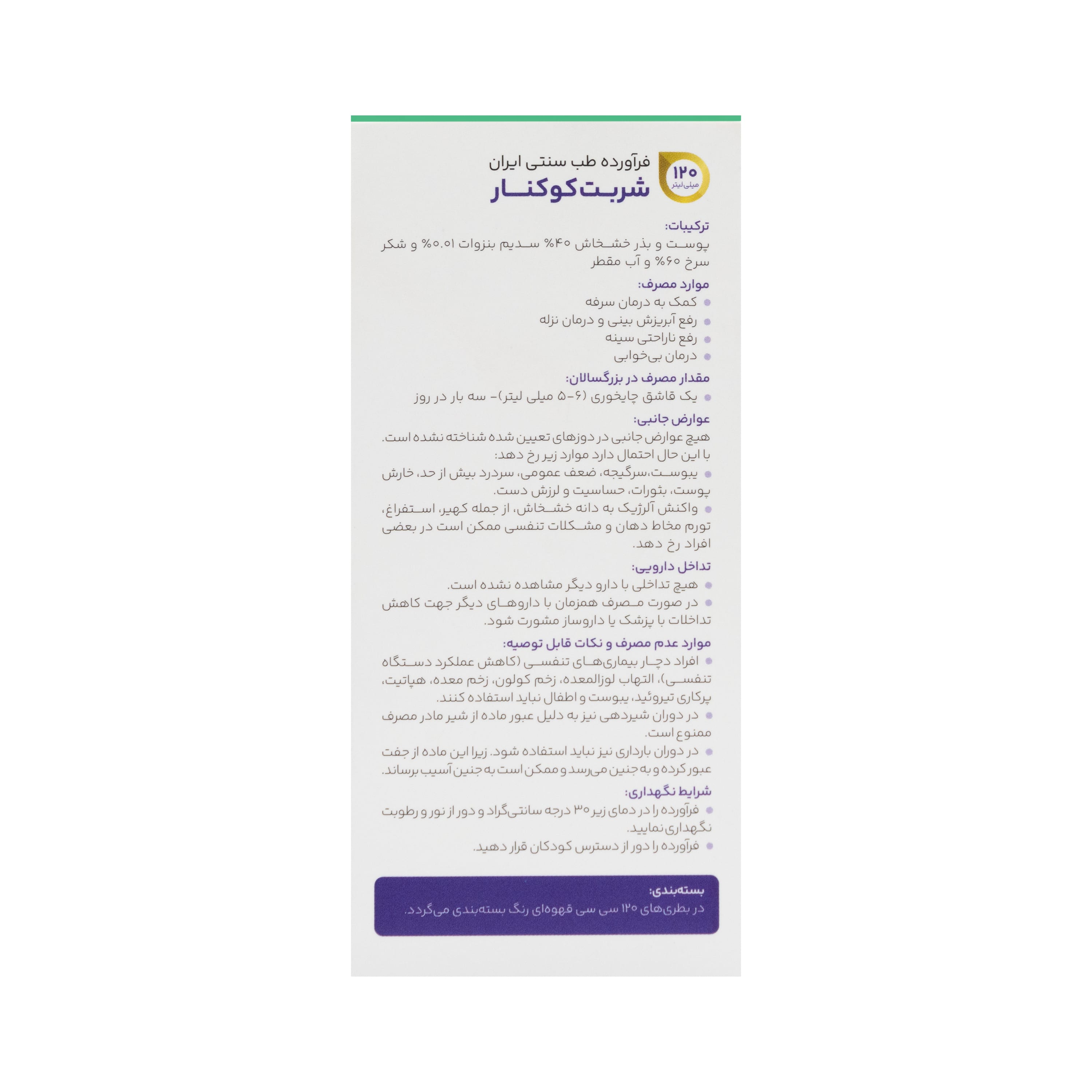 - حاوی پوست و بذر خشخاش 40%، سدیم بنزوات 0.01% و شکر سرخ 60% و آب مقطر