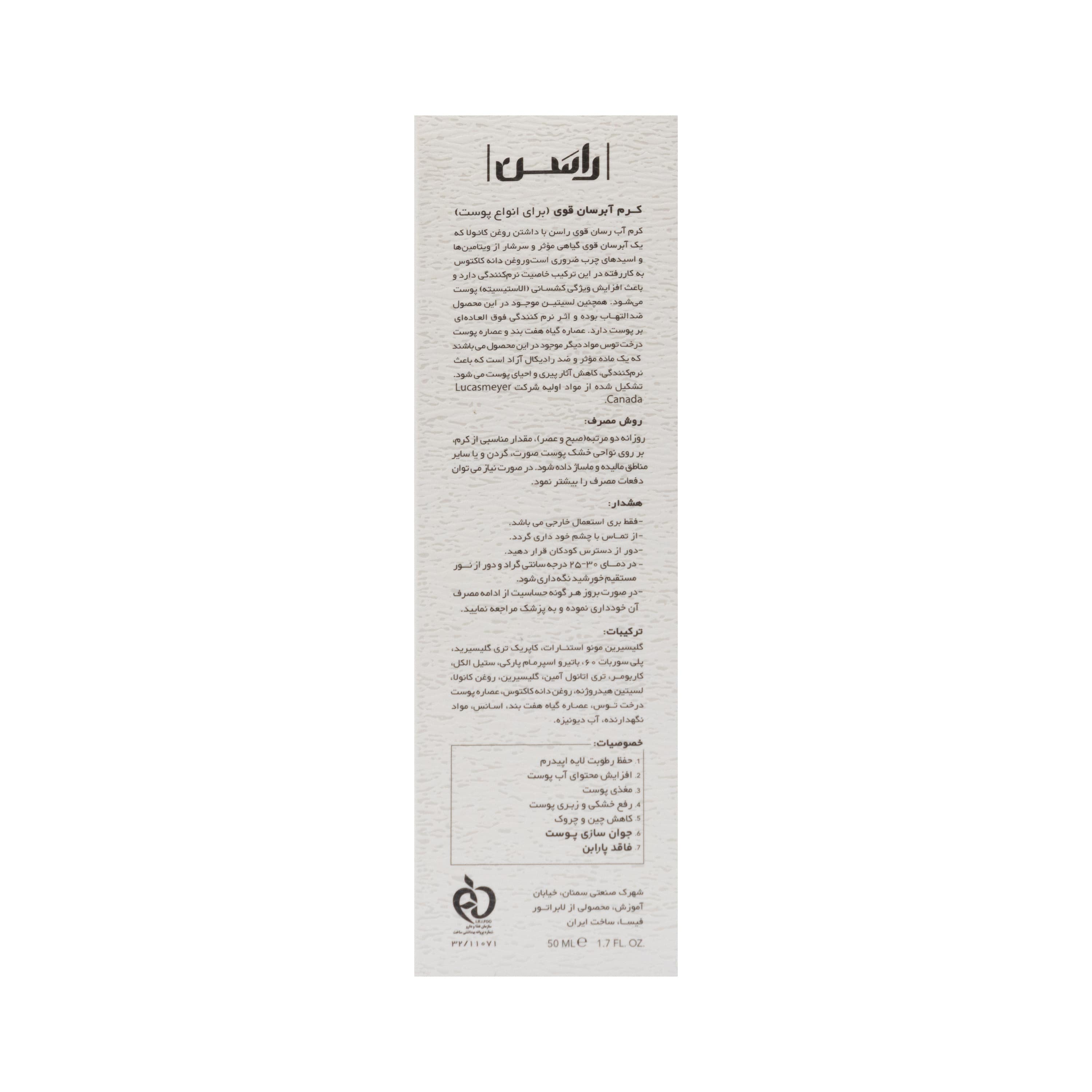 - کرم آب رسان قوی راسن با داشتن روغن کانولا که یک آبرسان قوی گیاهی موثر و سرشار از ویتامین ها و اسیدهای چرب ضروری است. روغن دانه کاکتوس به کار رفته در این ترکیب خاصیت نرم کنندگی دارد و باعث افزایش ویژگی کشسانی (الاستیسیته) پوست می شود.