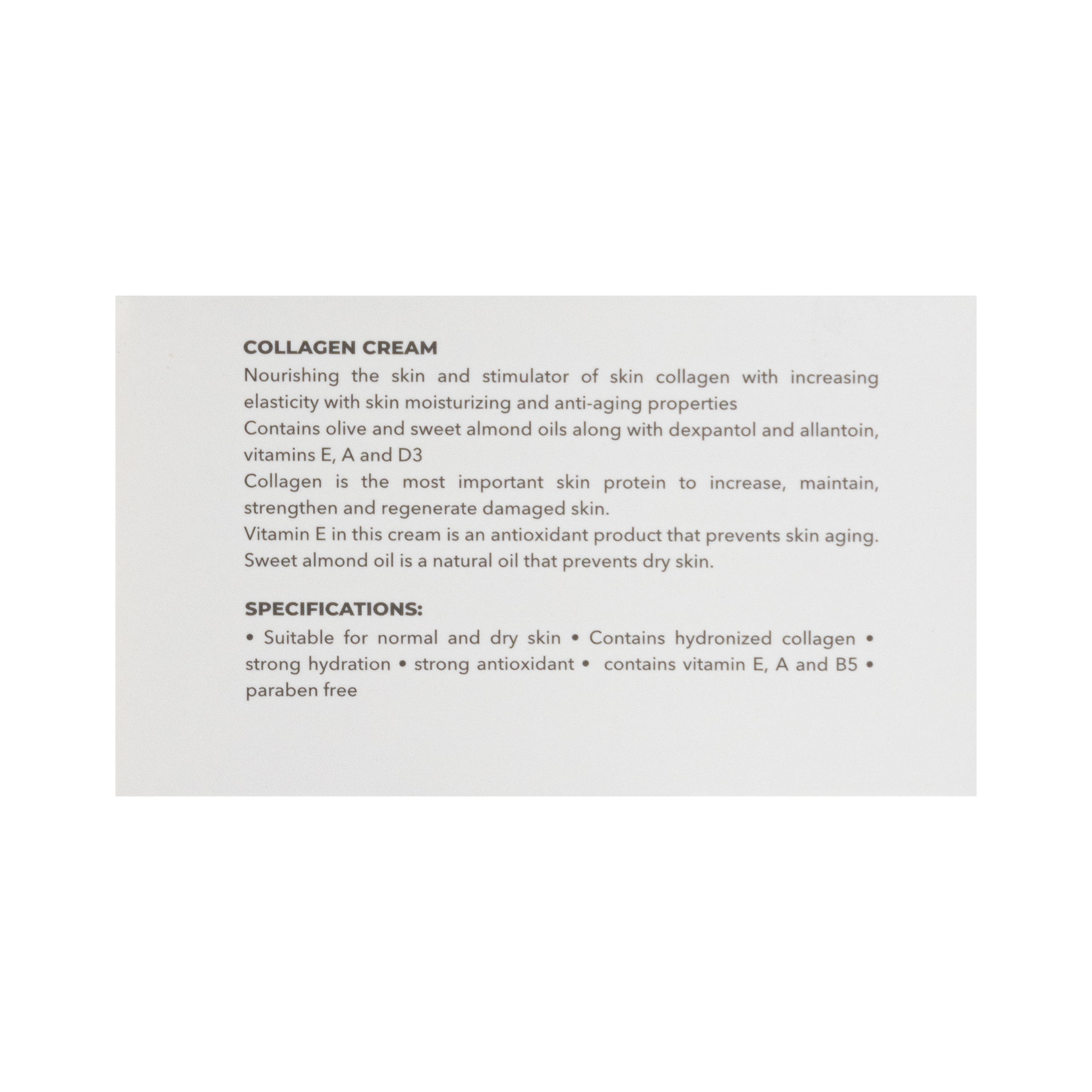 - حاوی کلاژن هیدرولیز شده، روغن های زیتون و بادام شیرین به همراه دکسپانتنول و آلانتوئین، ویتامین های A ،E و D3