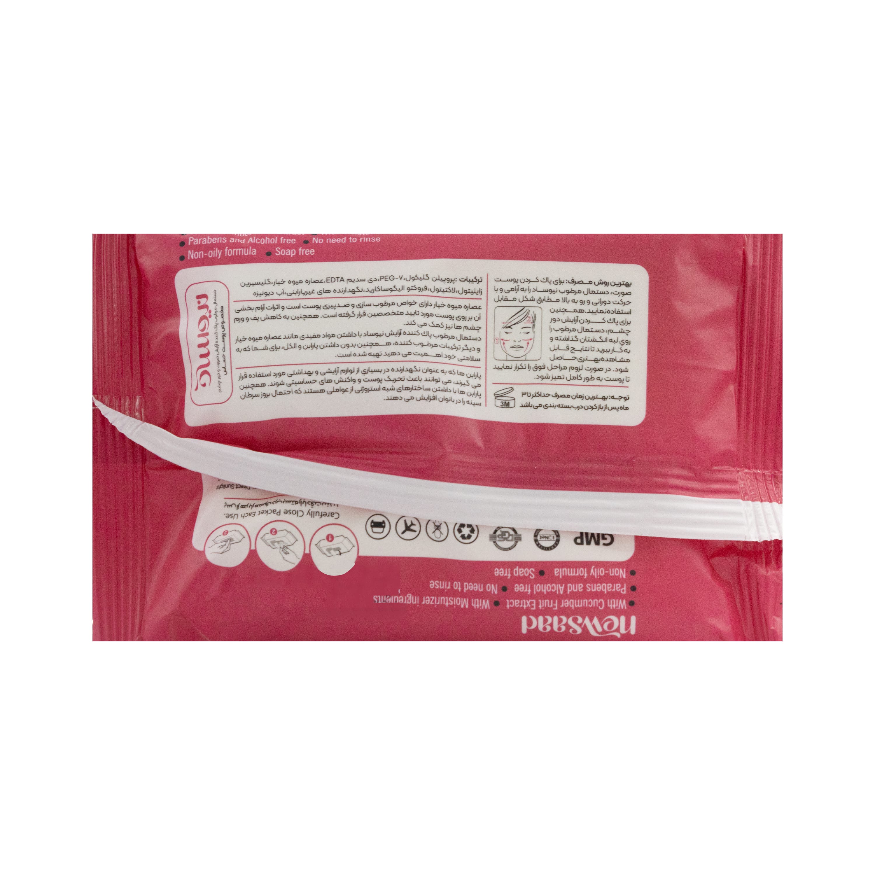 - عصاره میوه خیار دارای خواص مرطوب سازی و ضد پیری پوست است و اثرات آرام بخشی آن بر روی پوست مورد تایید متخصصین قرار گرفته است، همچنین به کاهش پف و ورم چشم ها نیز کمک می کند.دستمال مرطوب پاک کننده آرایش نیوساد با داشتن مواد مفیدی مانند عصاره میوه خیار و دیگر ترکیبات مرطوب کننده، همچنین بدون داشتن پارابن و الکل، برای شما که به سلامتی خود اهمیت می دهید تهیه شده است.