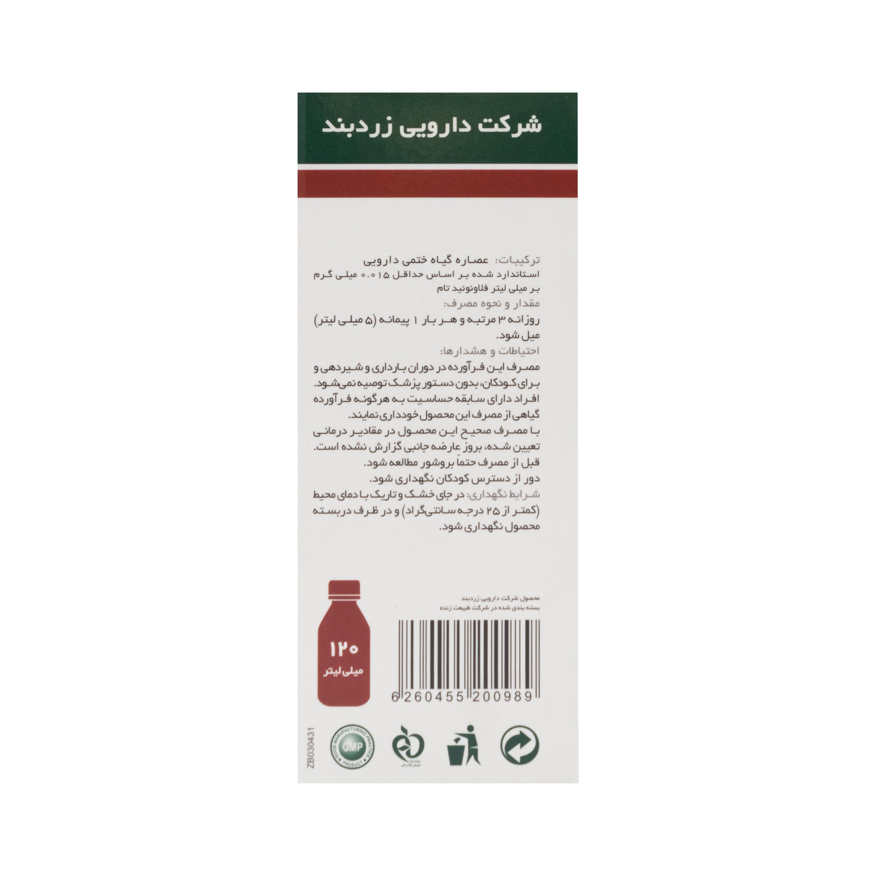 از آنجاییکه به منظور حفظ تمامی خواص عصاره طبیعی و خالص ختمی زردبند هیچ گونه مواد طعم دهنده و افزودنی به آن اضافه نشده است، مصرف این فرآورده ممکن است برای برخی افراد مشکل باشد. در این صورت می توانید آن را همراه با نوشیدنی میل نمایید.