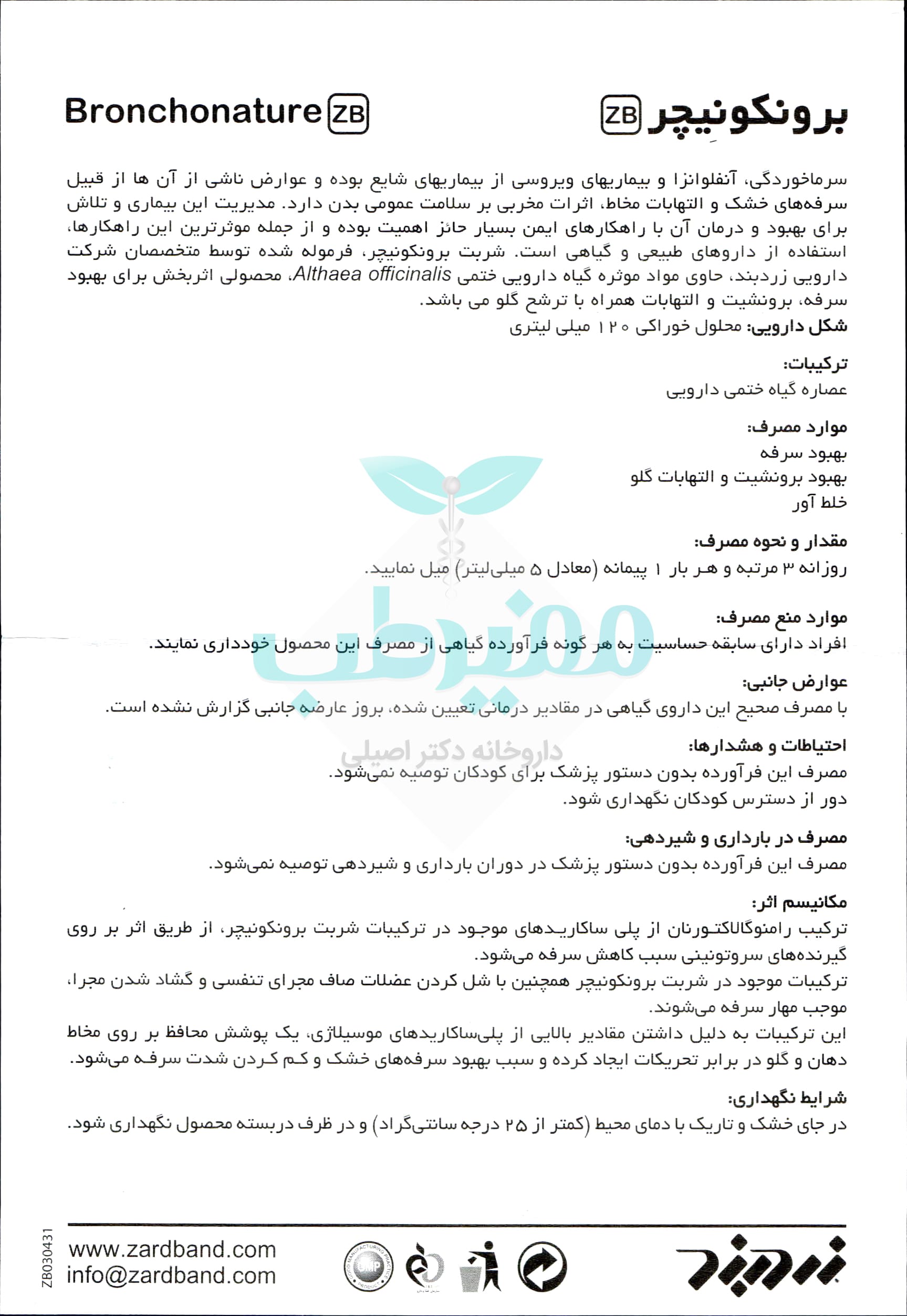 سرماخوردگی، آنفلوانزا و بیماری های ویروسی از بیماری های شایع بوده و عوارض ناشی از آن ها از قبیل سرفه های خشک و التهابات مخاط، اثرات مخربی بر سلامت عمومی بدن دارد. مدیریت این بیماری و تلاش برای بهبود و درمان آن با راهکارهای ایمن بسیار حائز اهمیت بوده و از جمله موثرترین این راهکارها، استفاده از داروهای طبیعی و گیاهی است. شربت برونکونیچر، فرموله شده توسط متخصصان شرکت دارویی زردبند، حاوی مواد موثره گیاه دارویی ختمی Althaea officinalis محصولی اثربخش برای بهبود سرفه، برونشیت و التهابات همراه با ترشح گلو می باشد.