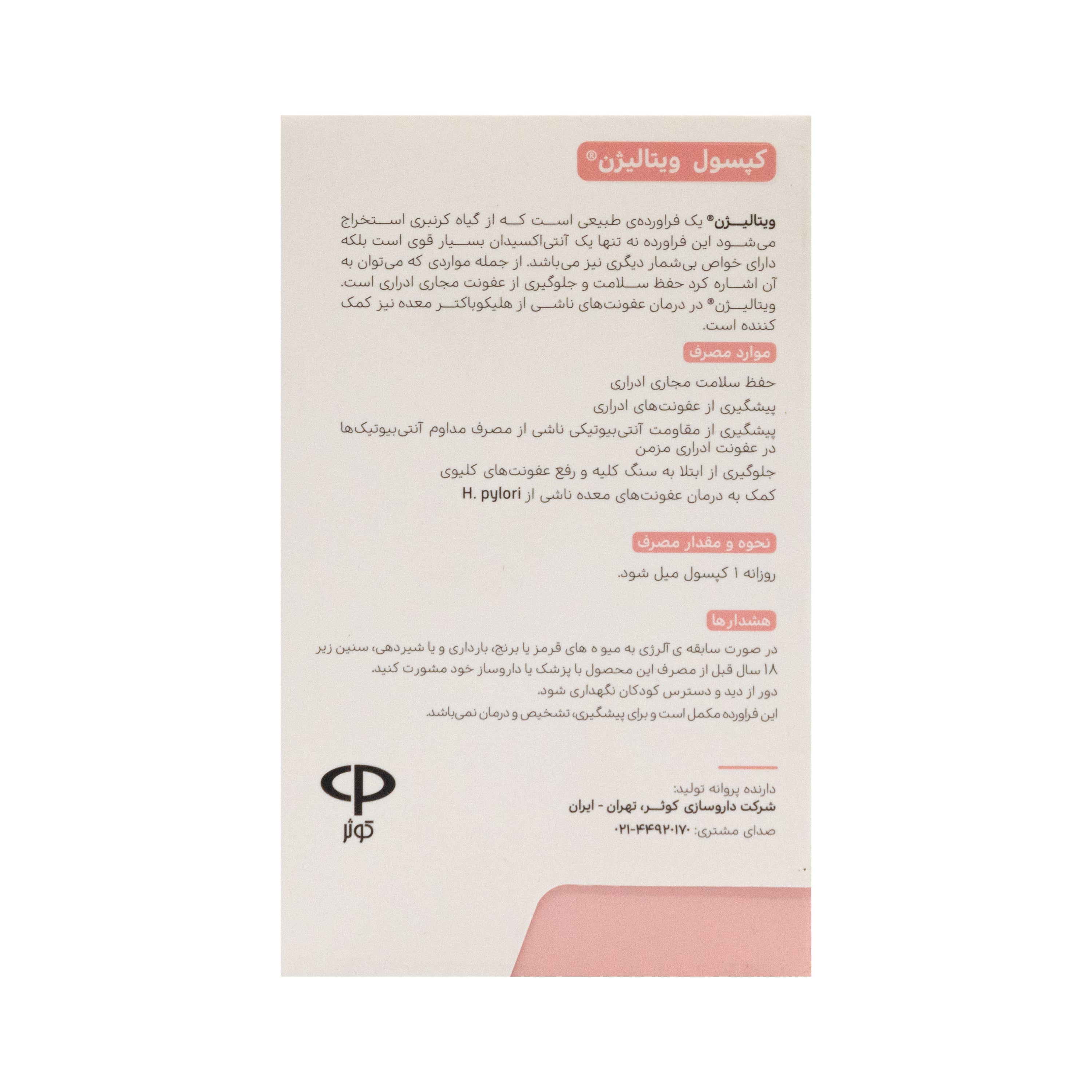 - این فرآورده مکمل است و برای تشخیص، پیشگیری و یا درمان نمی باشد.