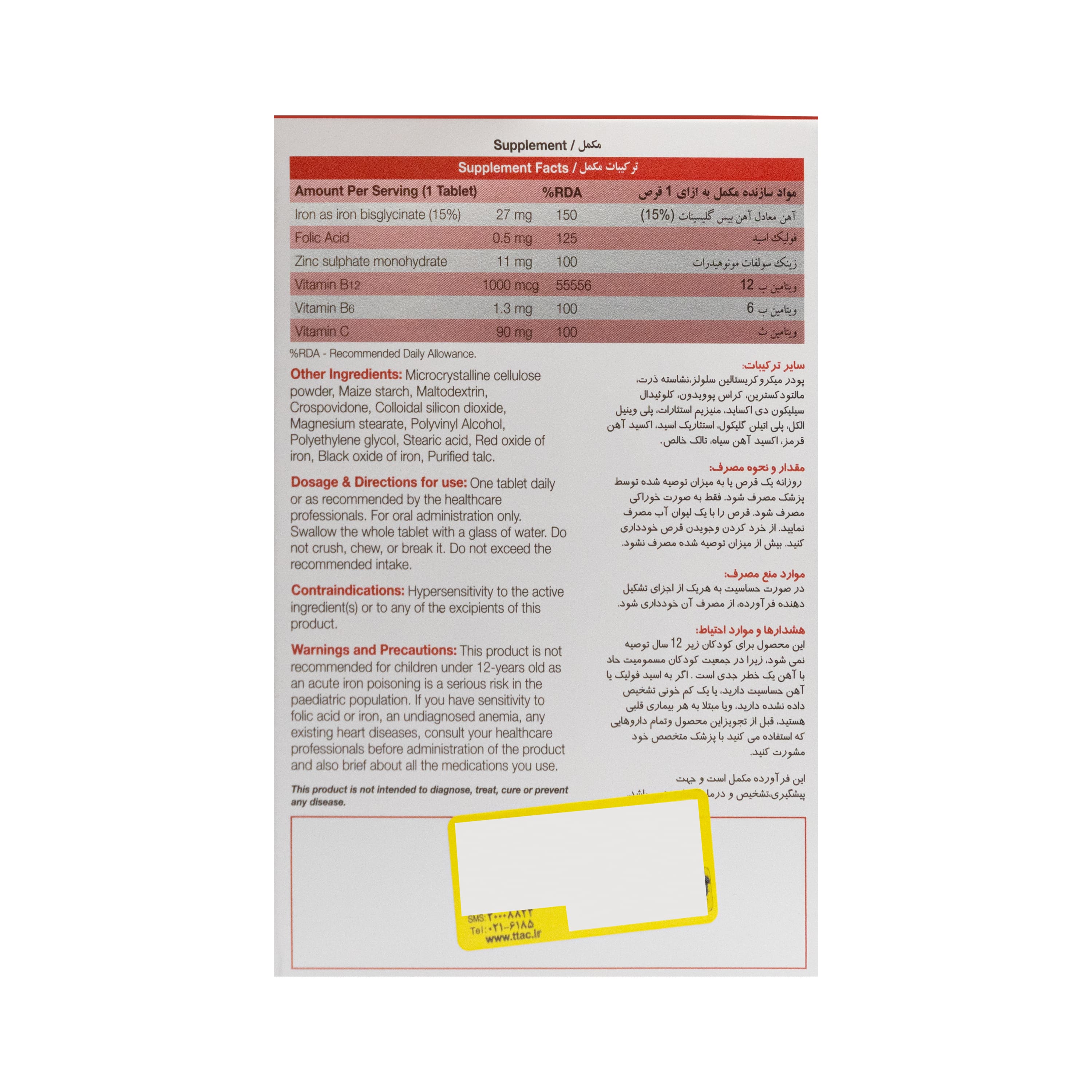 - این محصول برای کودکان زیر 12 سال توصیه نمی شود، زیرا در جمعیت کودکان مسمومیت حاد با آهن یک خطر جدی است.