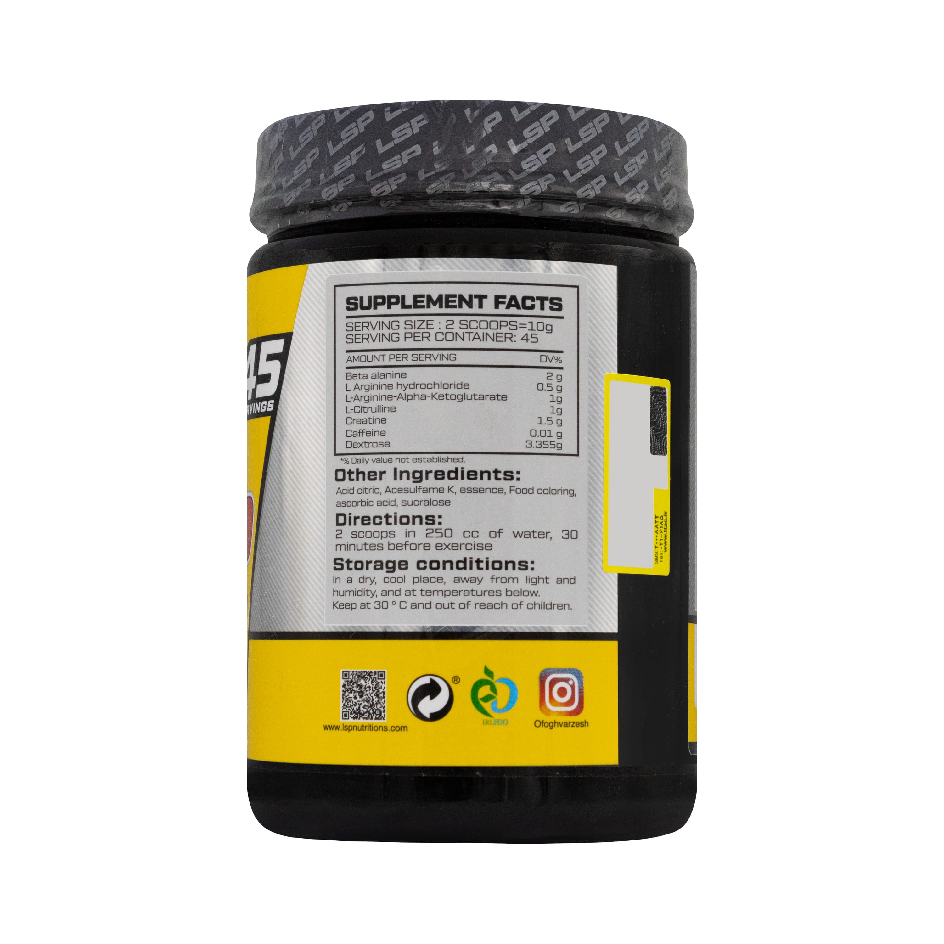 حاوی بتا آلانین، ال آرژنین، کراتین، ال سیترولین، دکستروز، کافئین