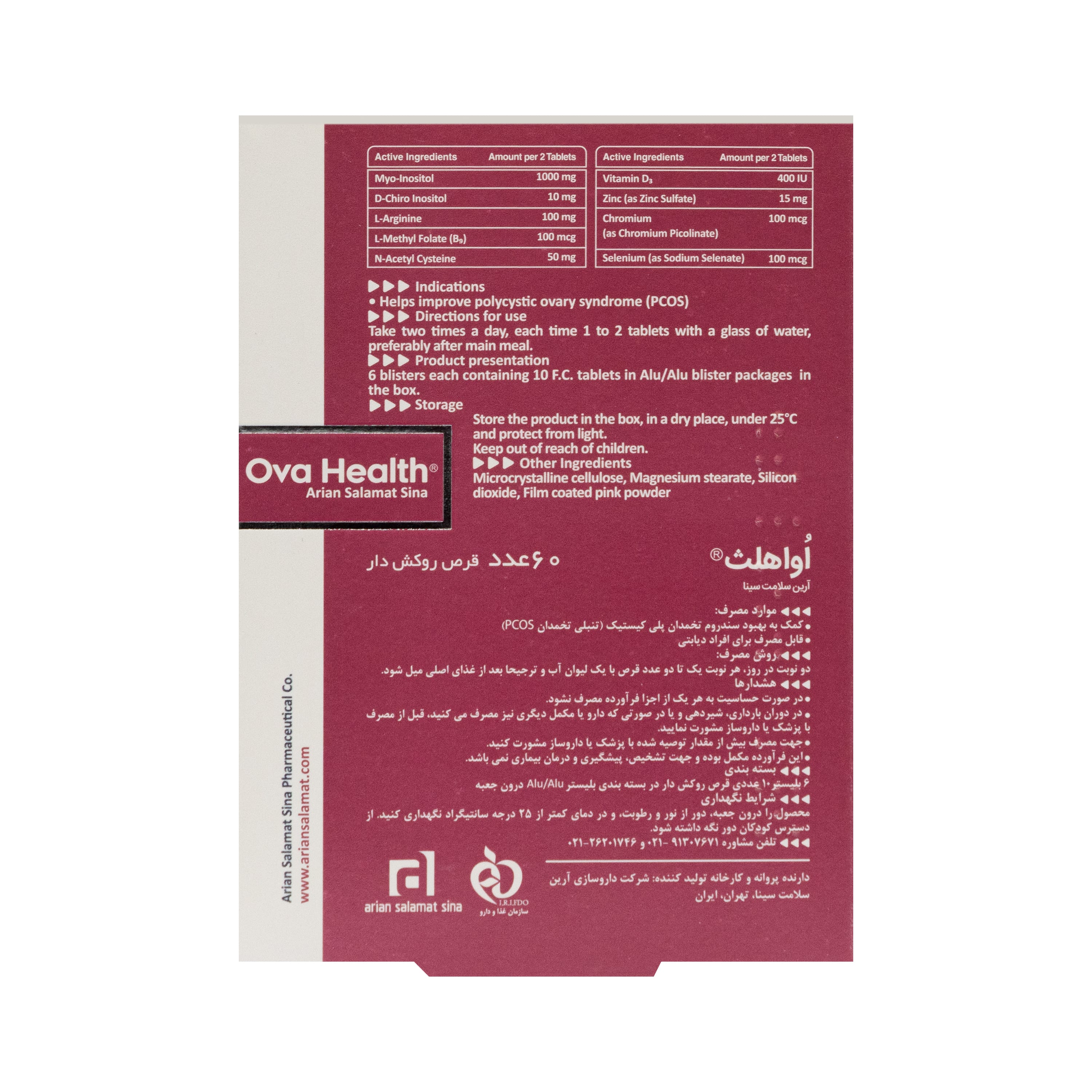 حاوی ان استیل سیستئین، ال متیل فولات، ال-آرژنین، ویتامین D3، کروم، زینک، سلنیوم