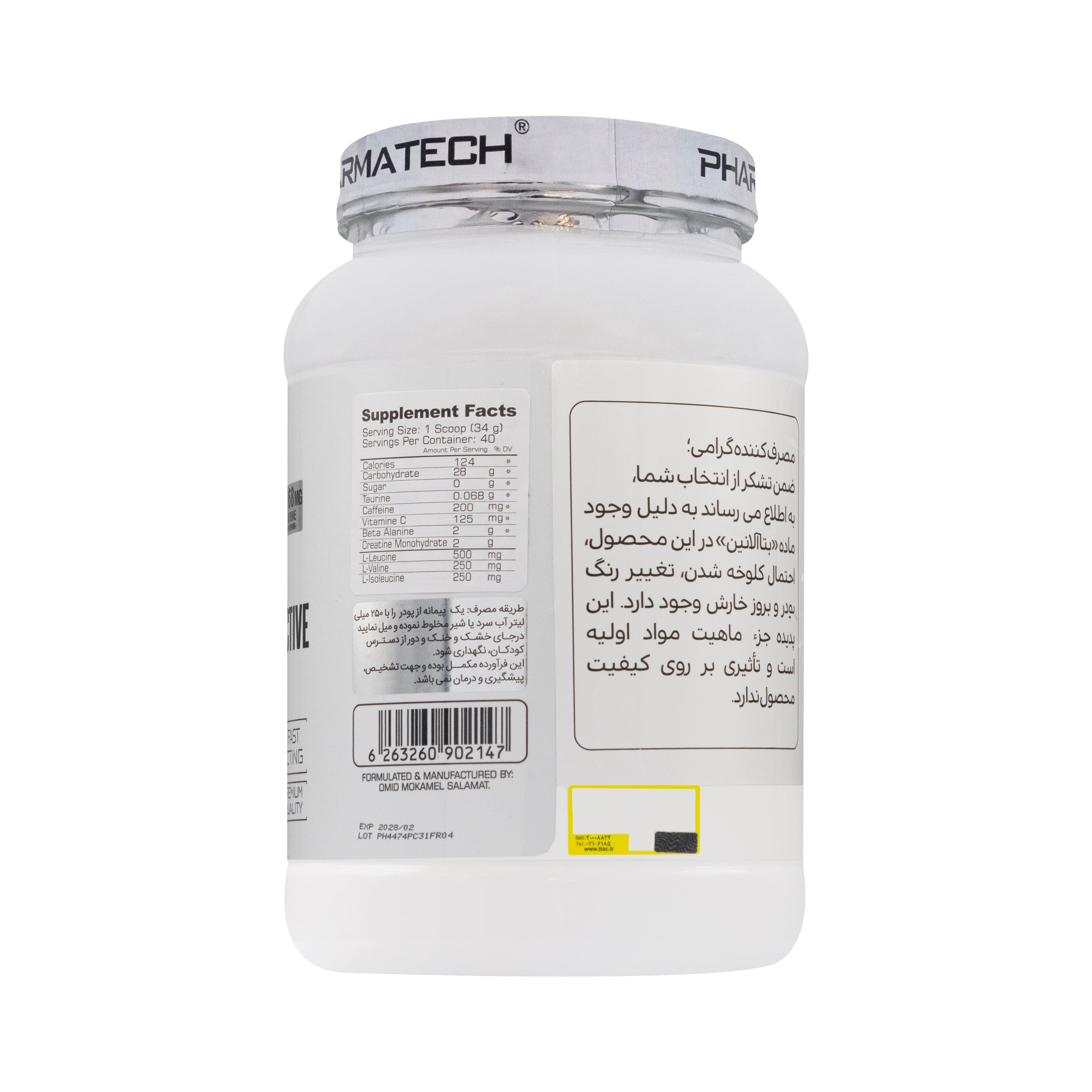 حاوی 200 میلی گرم کافئین و 68 میلی گرم تائورین، 31 گرم کربوهیدرات