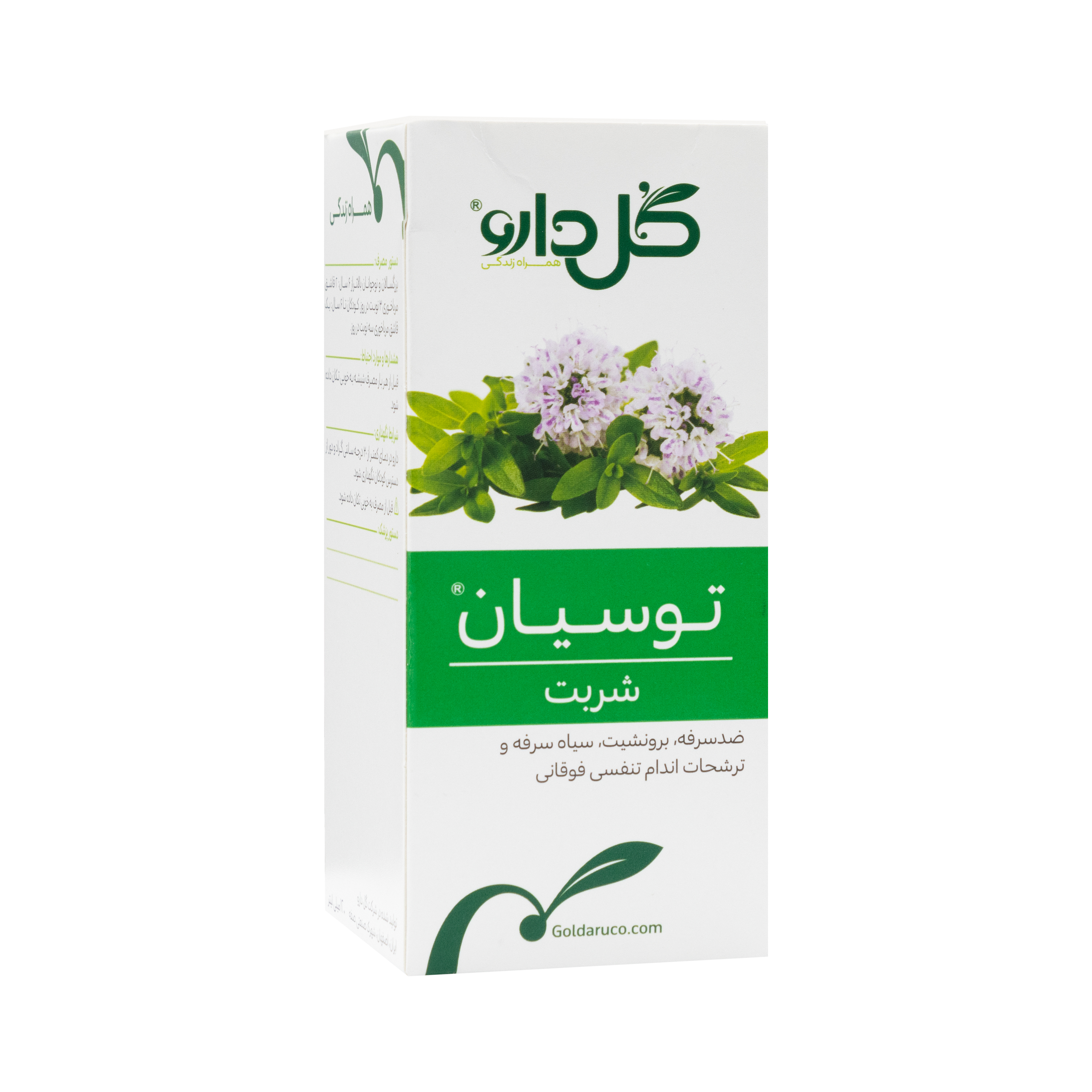 شربت توسیان گل دارو یک ضد سرفه گیاهی قوی است که برای سرفه، برونشیت، زکام، آسم، سیاه سرفه، التهاب مجاری تنفسی و انواع عفونت ریوی تاثیرگذاری قوی دارد. شرکت داروسازی معتبر گل دارو، این شربت را از عصاره آویشن تهیه کرده است.