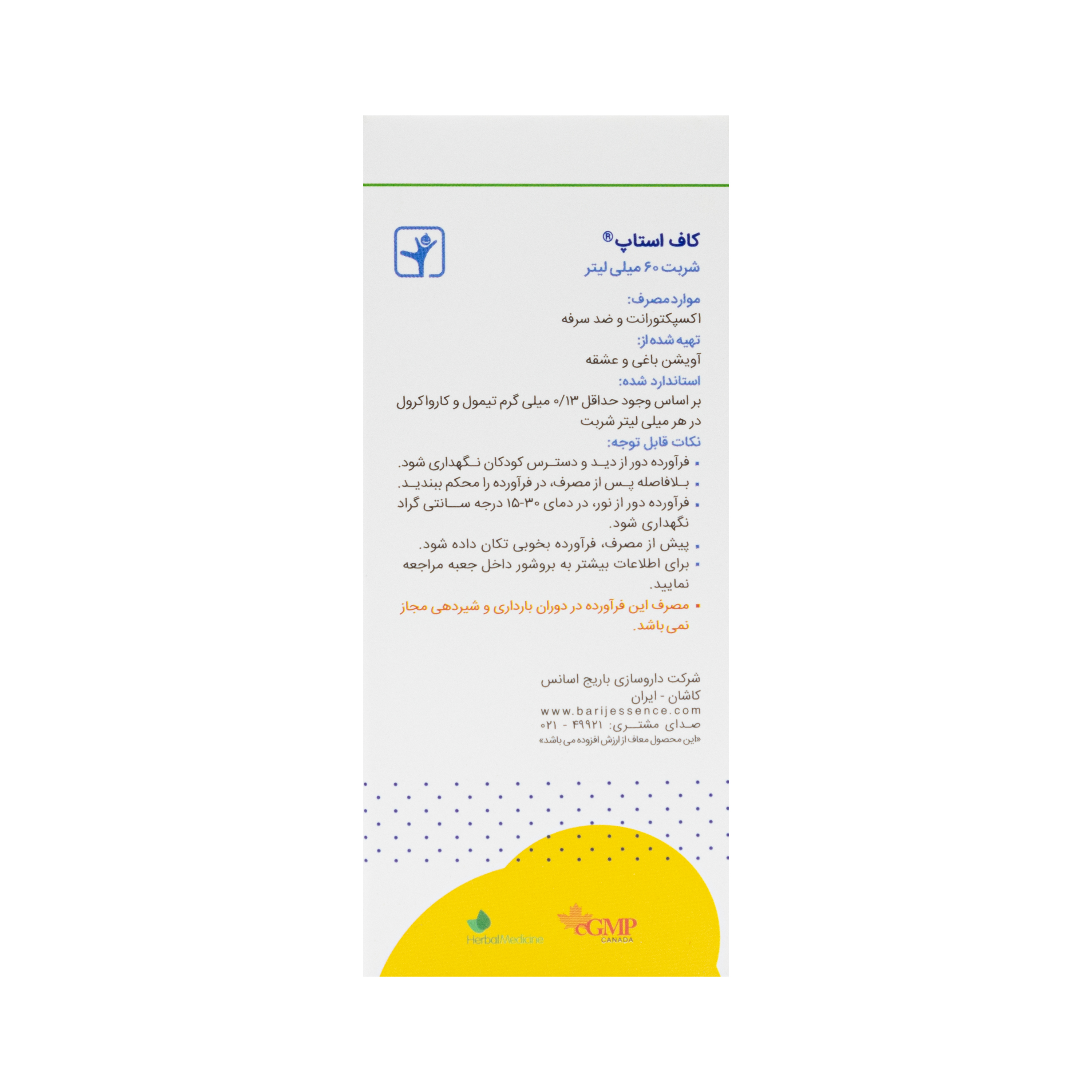 کاف استاپ باریج نام یک شربت گیاهی ضد سرفه و خلط آور (اکسپکتورانت) حاوی عشقه و عصاره آویشن می باشد که مخصوص استفاده کودکان (بالای یک سال) تهیه شده است. عصاره آویشن موجود در این شربت علاوه بر اینکه خواص ضد سرفه و خلط آور قوی دارد، نقش آنتی بیوتیکی نیز ایفا می کند. دیگر ترکیب گیاهی موجود در شربت کاف استاپ یعنی برگ عشقه نیز در بیماران مبتلا به بیماری های تنفسی توام با سرفه های خلط دار (productive cough) به عنوان یک اکسپکتورانت عمل کرده و تاثیرات رقیق کننده خلط و گشاد کننده راه های هوایی دارد.